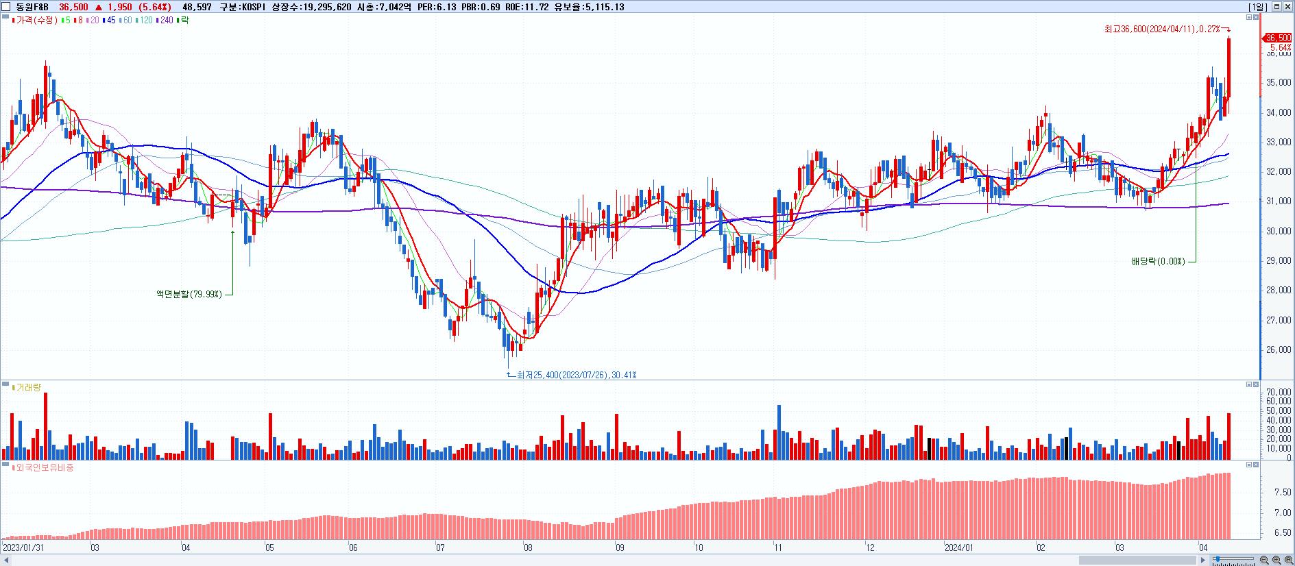 - 동원F&B (36,500원 ▲ 5.64% , 시총: 7,043억, 거래량: 48,597, 거래대금:17억, KOSPI)