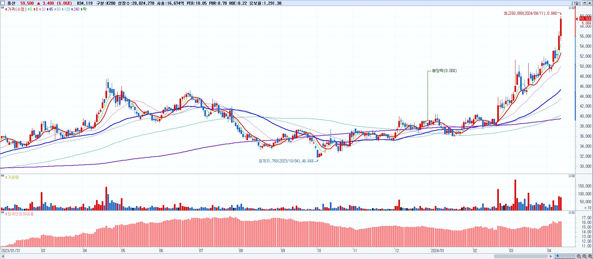 - 풍산 (59,500원 ▲ 6.06% , 시총: 16,674억, 거래량: 834,119, 거래대금:485억, KOSPI)