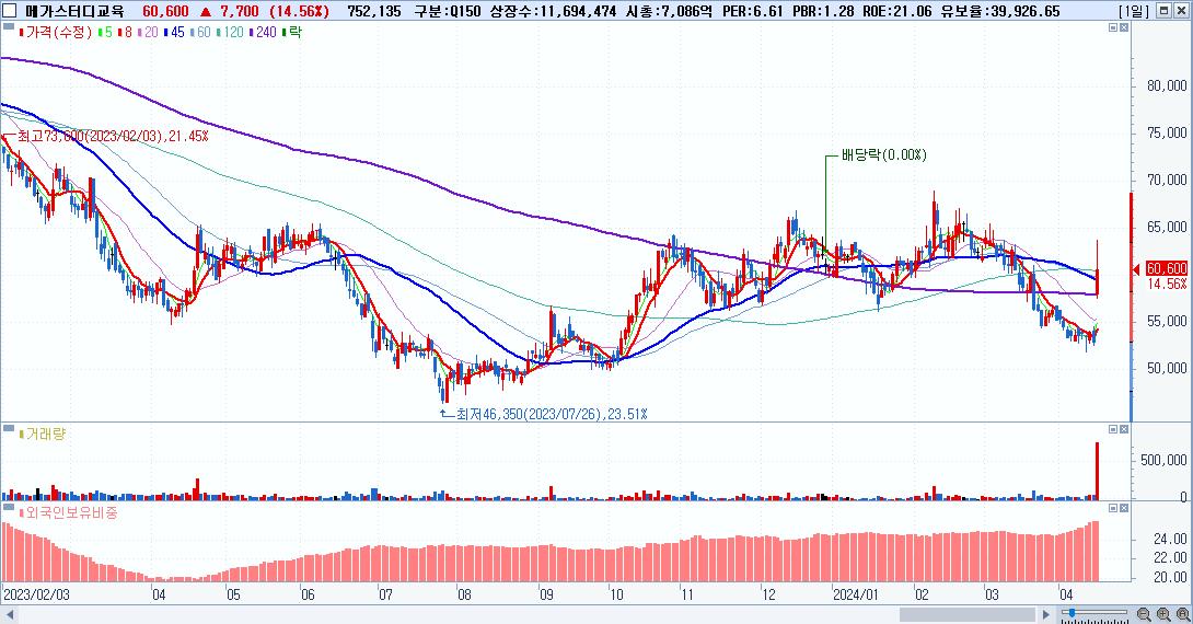 - 메가스터디교육 (60,600원 ▲ 14.56% , 시총: 7,087억, 거래량: 752,135, 거래대금:458억)