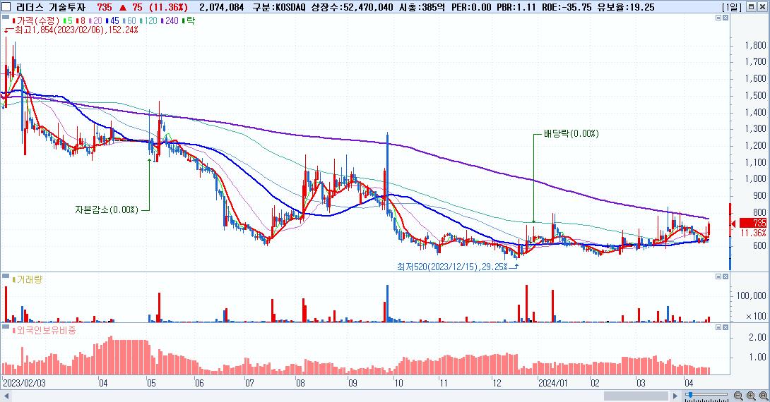 - 리더스 기술투자 (735원 ▲ 11.36% , 시총: 386억, 거래량: 2,074,084, 거래대금:15억)