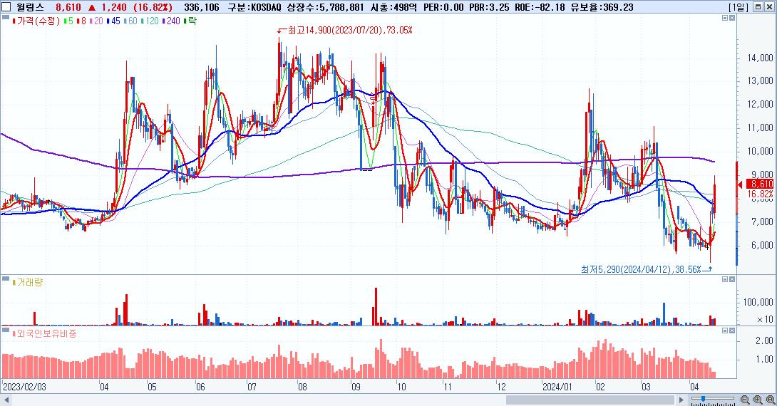 - 윌링스 (8,610원 ▲ 16.82% , 시총: 498억, 거래량: 336,106, 거래대금:28억)
