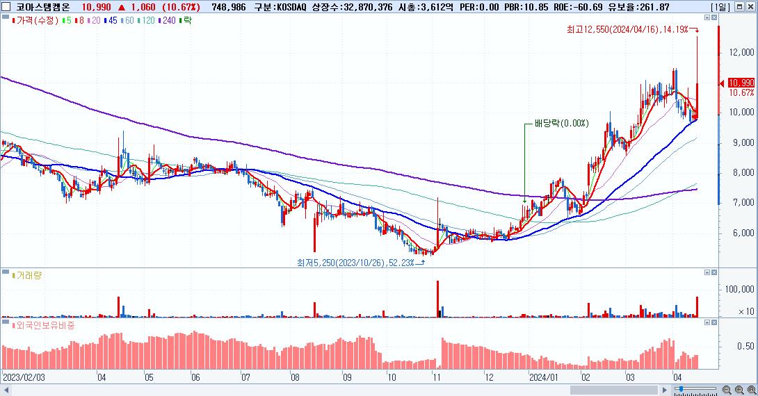 - 코아스템켐온 (10,990원 ▲ 10.67% , 시총: 3,612억, 거래량: 748,986, 거래대금:85억)