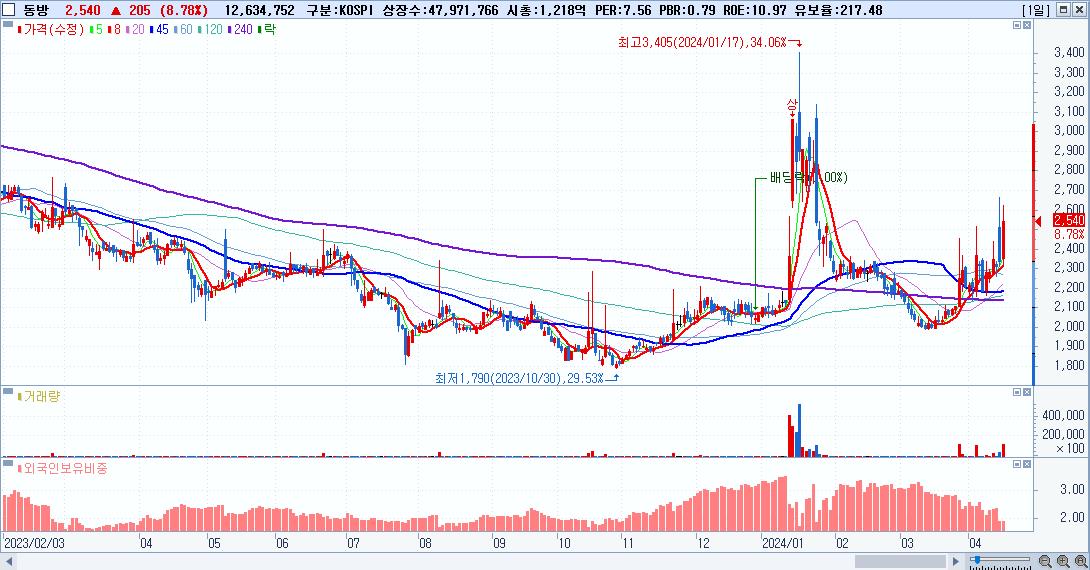 - 동방 (2,540원 ▲ 8.78% , 시총: 1,218억, 거래량: 12,634,752, 거래대금:318억)
