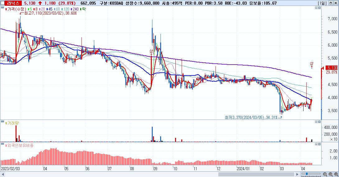 - 라닉스 (5,130원 ▲ 29.87% , 시총: 496억, 거래량: 662,095, 거래대금:34억)