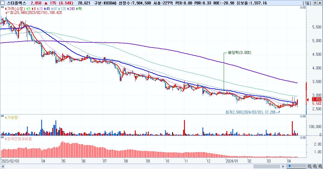 - 스타플렉스 (2,850원 ▲ 6.54% , 시총: 228억, 거래량: 28,621, 거래대금:1억)
