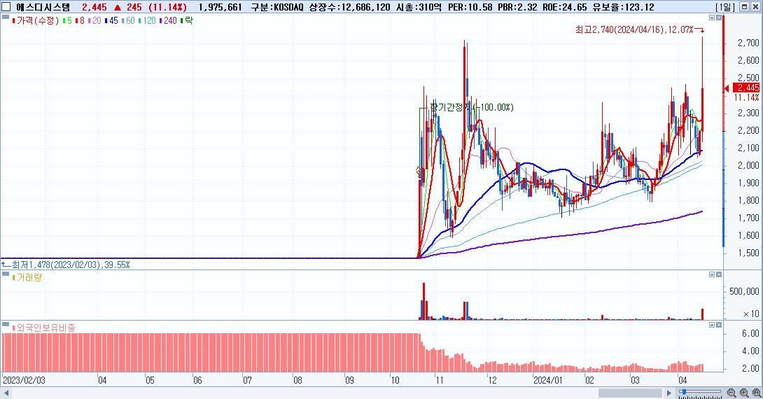 - 에스디시스템 (2,445원 ▲ 11.14% , 시총: 310억, 거래량: 1,975,661, 거래대금:49억)