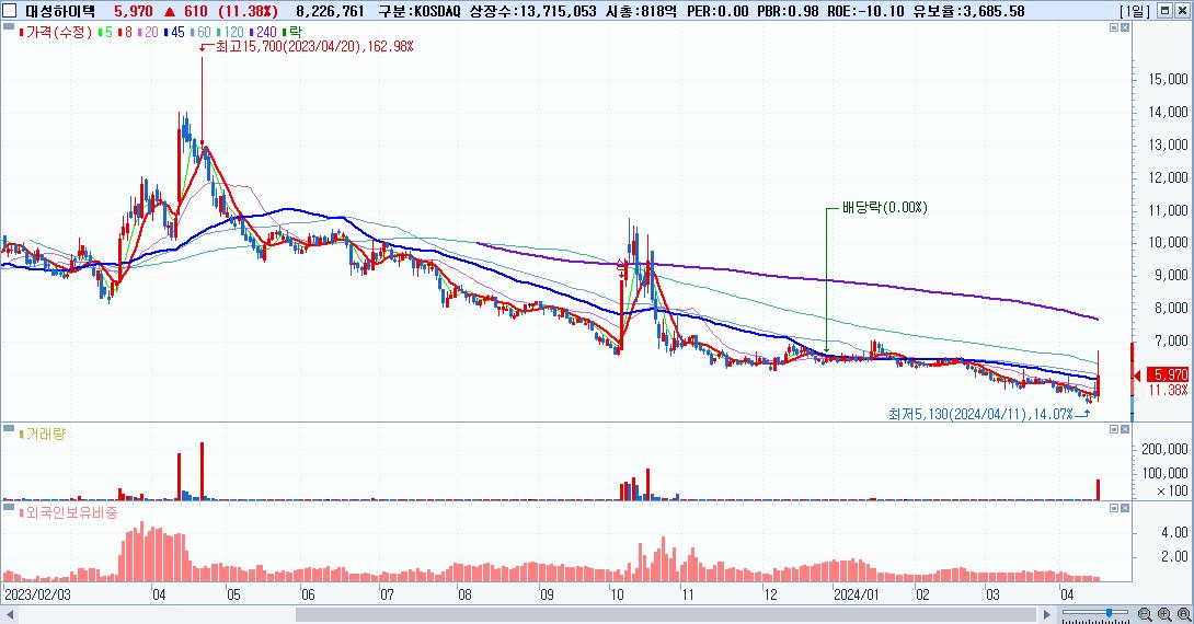- 대성하이텍 (5,970원 ▲ 11.38% , 시총: 819억, 거래량: 8,226,761, 거래대금:510억)
