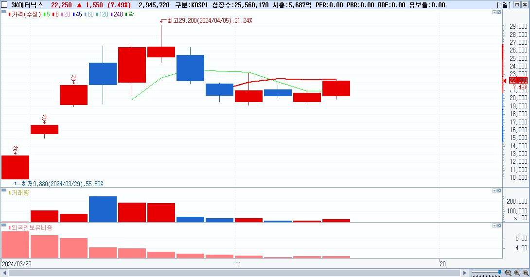- SK이터닉스 (22,250원 ▲ 7.49% , 시총: 5,687억, 거래량: 2,945,720, 거래대금:628억)