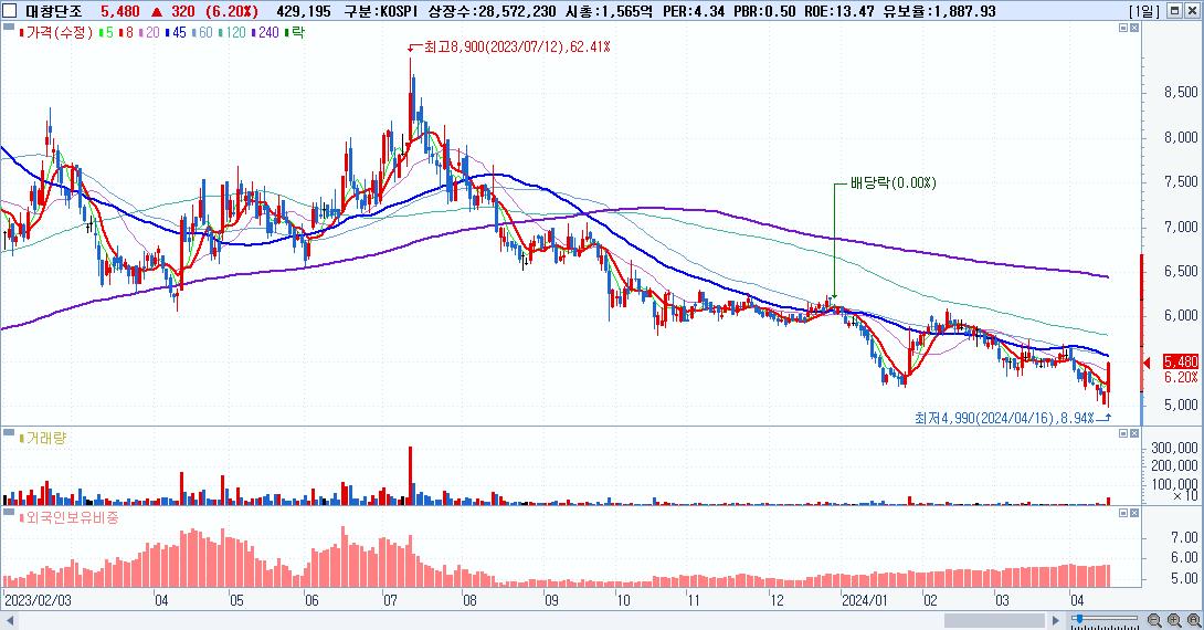 - 대창단조 (5,480원 ▲ 6.2% , 시총: 1,566억, 거래량: 429,195, 거래대금:23억)