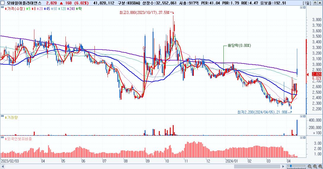 - 모바일어플라이언스 (2,820원 ▲ 6.02% , 시총: 918억, 거래량: 41,820,112, 거래대금:1,293억)
