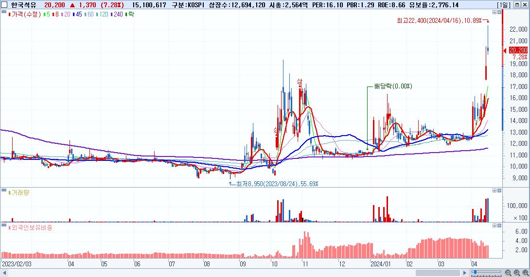 - 한국석유 (20,200원 ▲ 7.28% , 시총: 2,564억, 거래량: 15,100,617, 거래대금:3,193억)