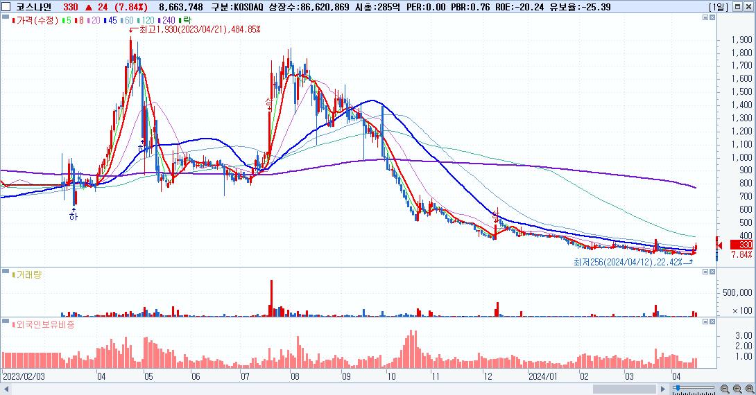 - 코스나인 (330원 ▲ 7.84% , 시총: 286억, 거래량: 8,663,748, 거래대금:28억)