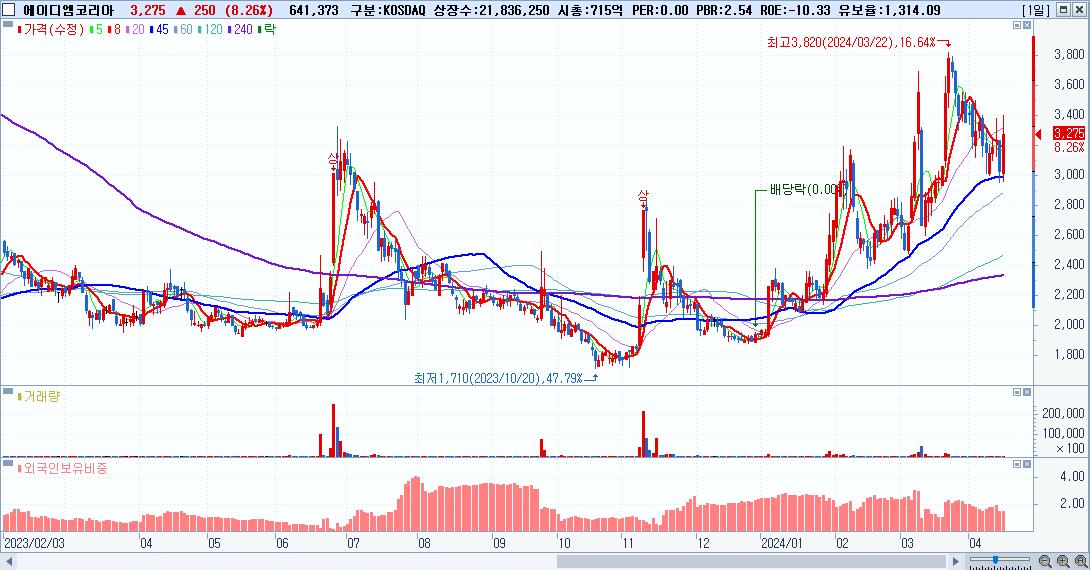 - 에이디엠코리아 (3,275원 ▲ 8.26% , 시총: 715억, 거래량: 641,373, 거래대금:21억)