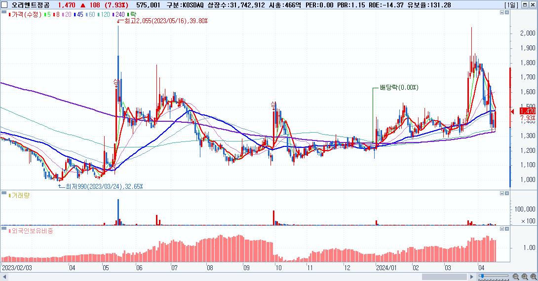 - 오리엔트정공 (1,470원 ▲ 7.93% , 시총: 467억, 거래량: 575,001, 거래대금:8억)