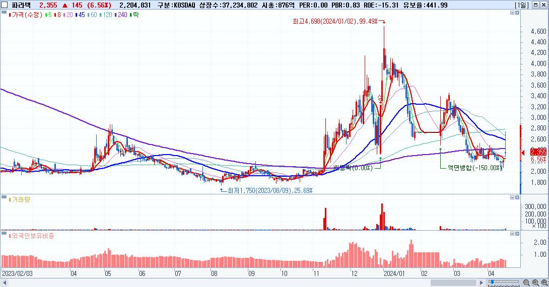 - 파라텍 (2,355원 ▲ 6.56% , 시총: 877억, 거래량: 2,204,831, 거래대금:55억)