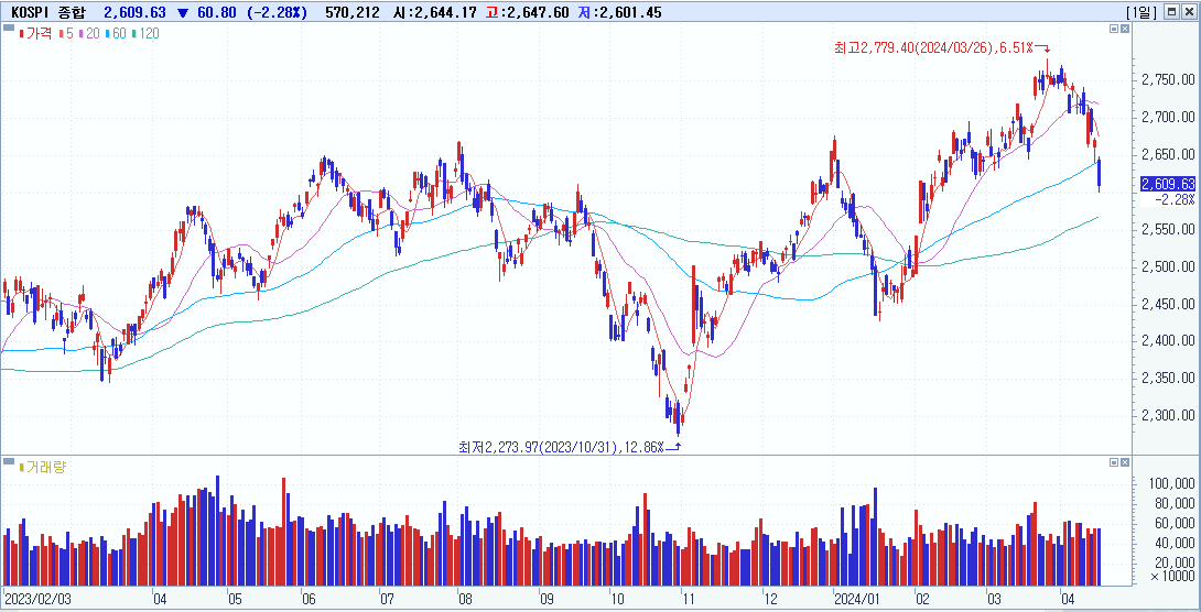 - 코스피와 코스닥 지수가 각각 2.28%와 2.30% 급락, 중동 지역의 긴장과 미국의 고금리 우려