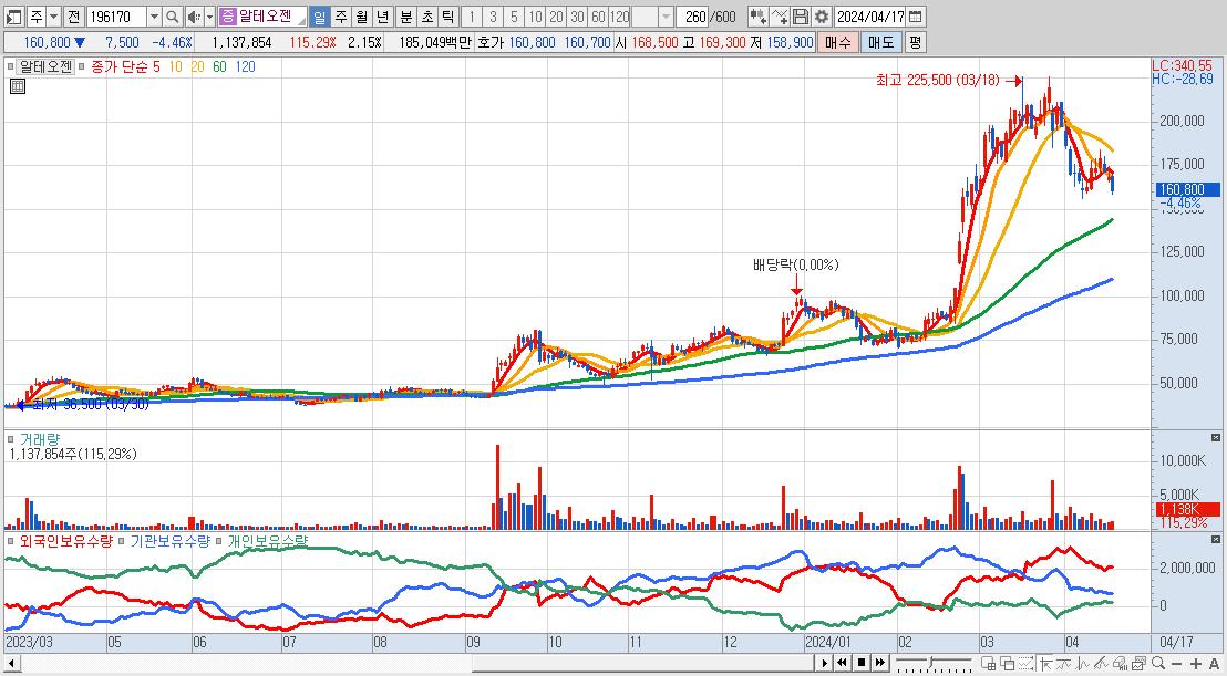 - 알테오젠 (160,800원 ▼ -4.46% , 시총: 85,243억, 외국인 순매수 거래금:56억)