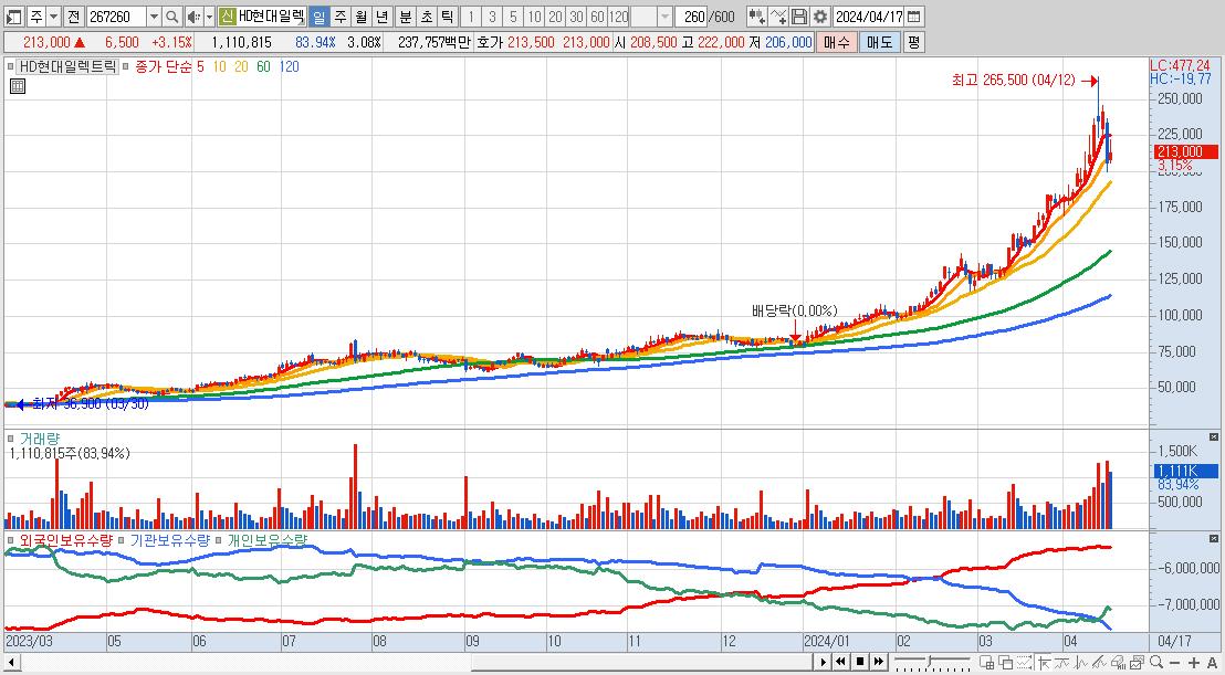 1.HD현대일렉트릭 213,000원 ▲ 3.15% (KOSPI, 267260)