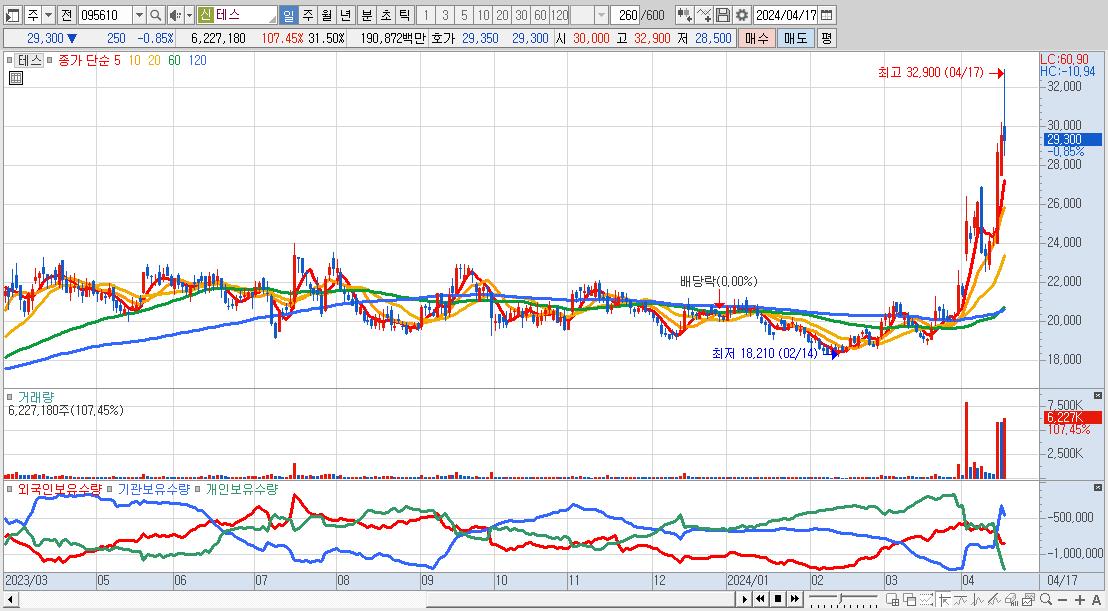 - 테스 (29,300원 ▼ -0.85% , 시총: 5,792억, 외국인 순매수 거래금:83억)