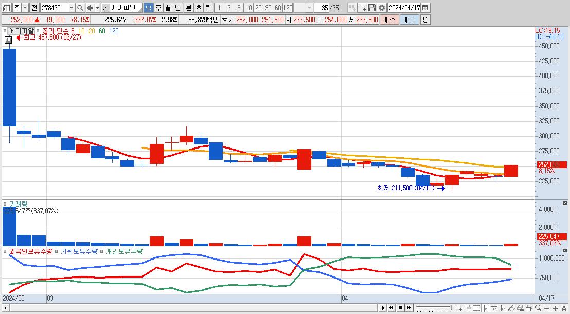 - 에이피알 (252,000원 ▲ 8.15% , 시총: 19,113억, 외국인 순매수 거래금:133억)