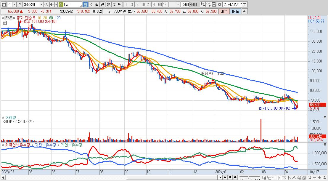 - F&F (65,500원 ▲ 5.31% , 시총: 25,091억, 외국인 순매수 거래금:38억)