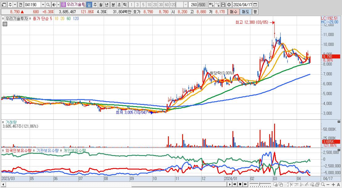 - 우리기술투자 (8,790원 ▲ 8.38% , 시총: 7,384억, 외국인 순매수 거래금:64억)