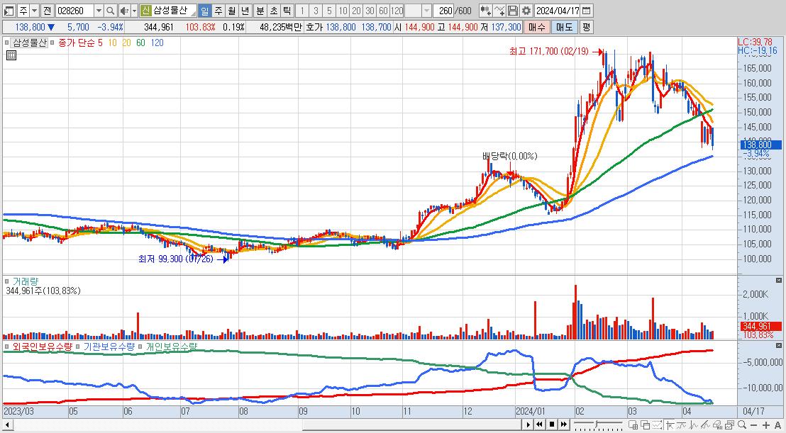 - 삼성물산 (138,800원 ▼ -3.94% , 시총: 257,601억, 외국인 순매수 거래금:59억)