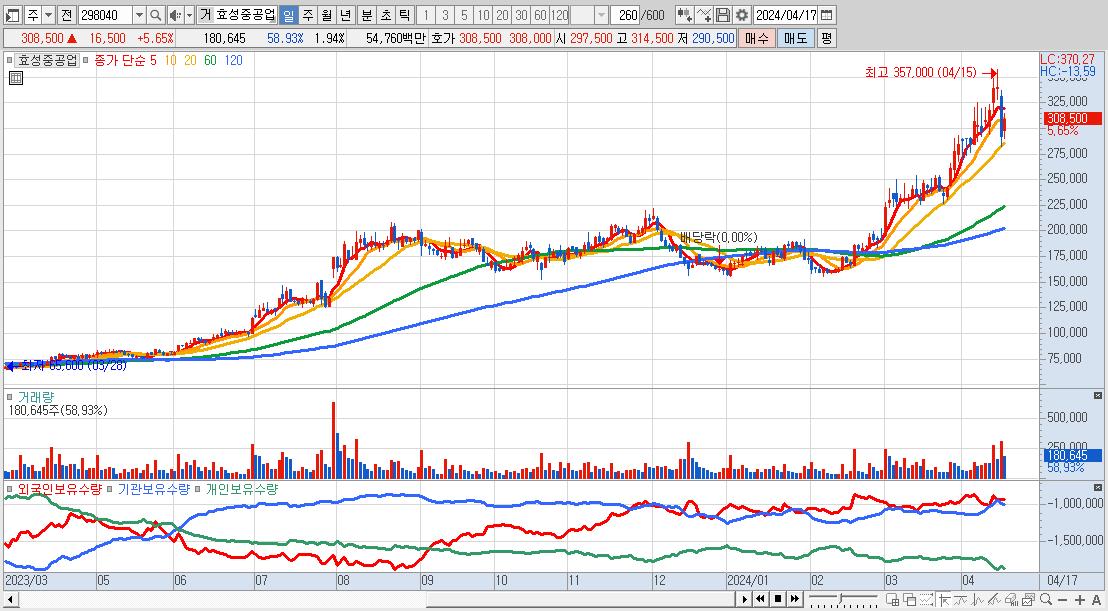 - 효성중공업 (308,500원 ▲ 5.65% , 시총: 28,766억, 외국인 순매수 거래금:63억)