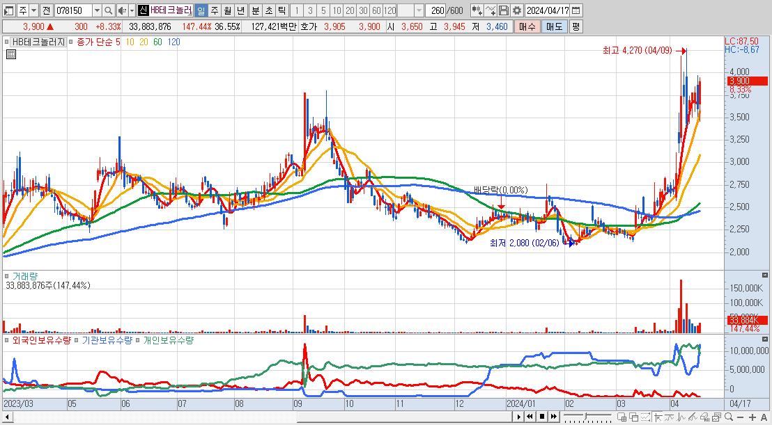 - HB테크놀러지 (3,900원 ▲ 8.33% , 시총: 3,616억, 외국인 순매수 거래금:78억)