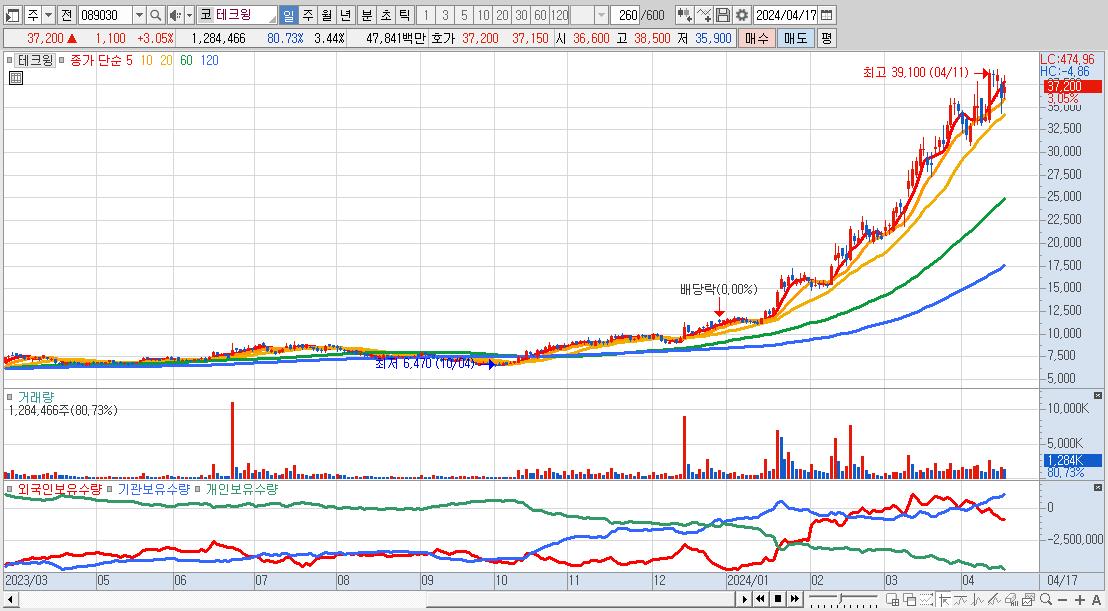 - 테크윙 (37,200원 ▲ 3.05% , 시총: 13,896억, 외국인 순매수 거래금:45억)