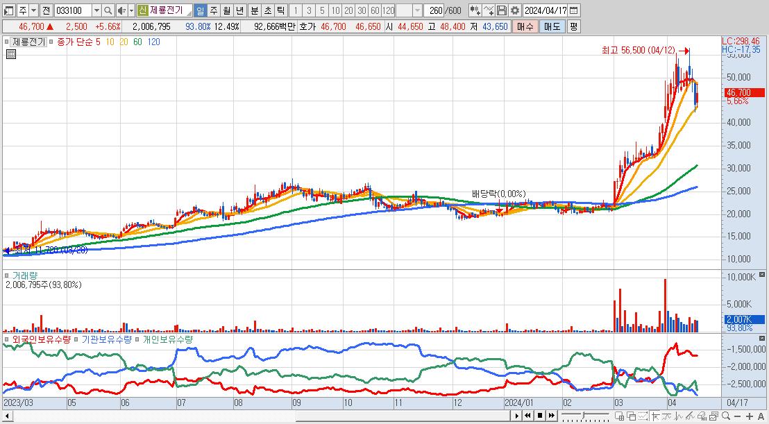 - 제룡전기 (46,700원 ▲ 5.66% , 시총: 7,501억, 외국인 순매수 거래금:154억)
