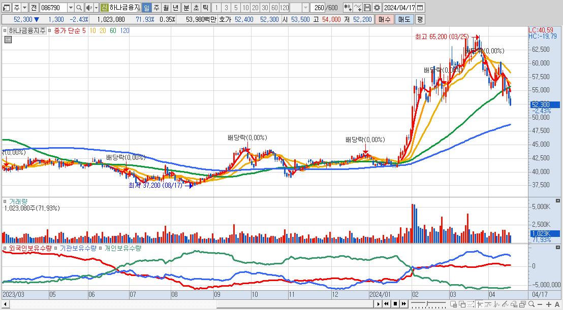 - 하나금융지주 (52,300원 ▼ -2.43% , 시총: 152,903억, 외국인 순매수 거래금:53억)