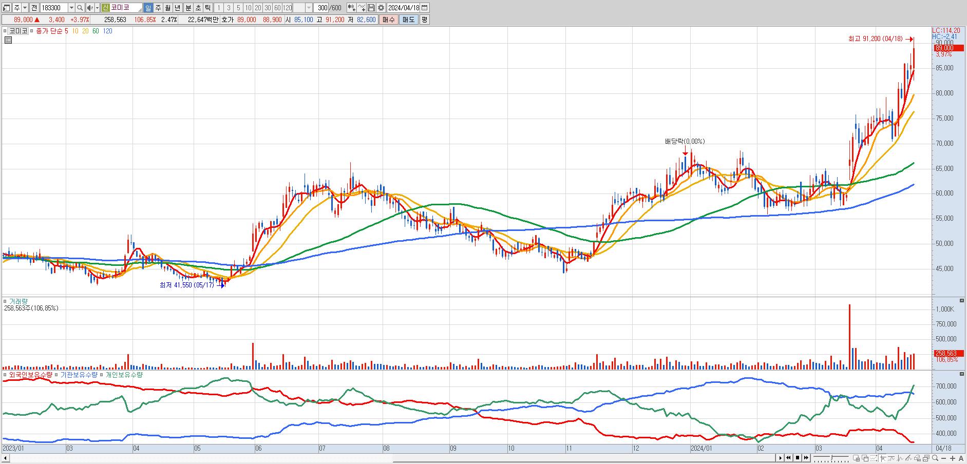- 코미코 (89,000원 ▲ 3.97% , 시총: 9,310억, 거래량: 257,948, 거래대금:226억, KOSDAQ)