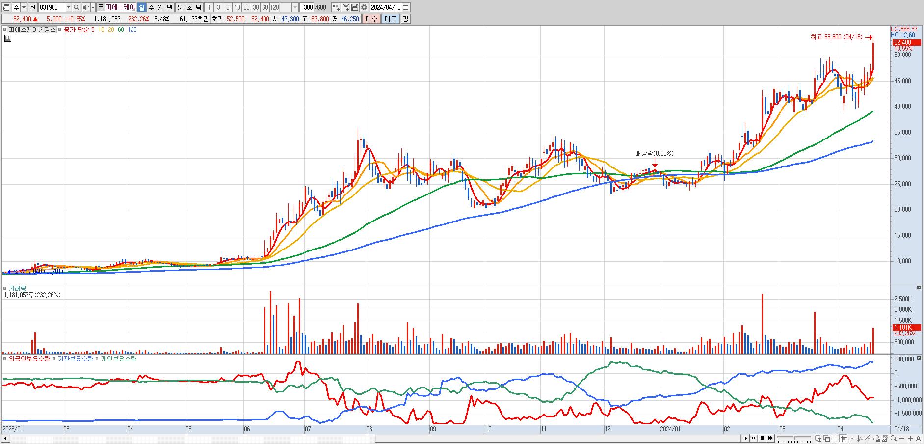 - 피에스케이홀딩스 (52,400원 ▲ 10.55% , 시총: 11,299억, 거래량: 1,177,714, 거래대금:610억, KOSDAQ)