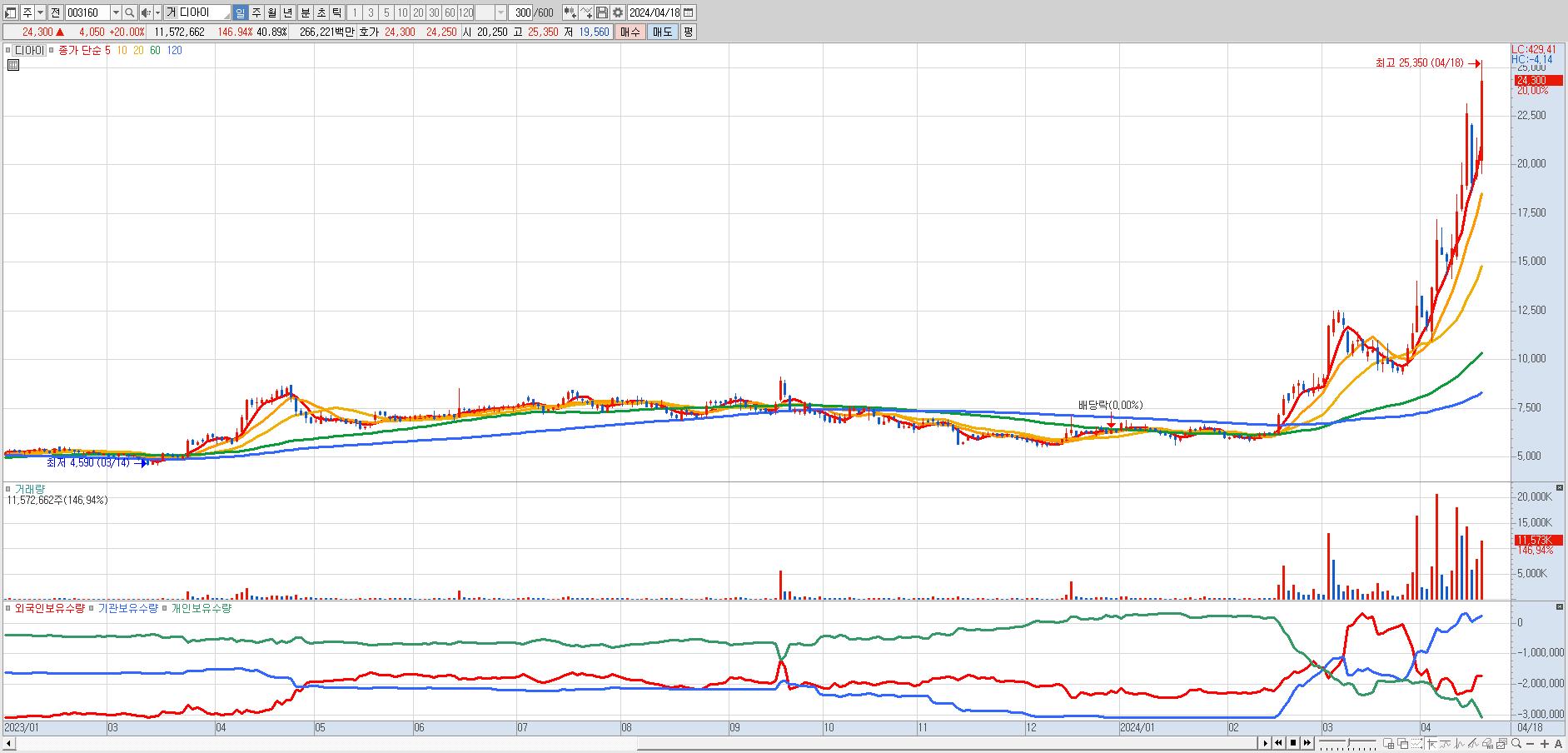 - 디아이 (24,300원 ▲ 20% , 시총: 6,877억, 거래량: 11,416,983, 거래대금:2,625억, KOSPI)