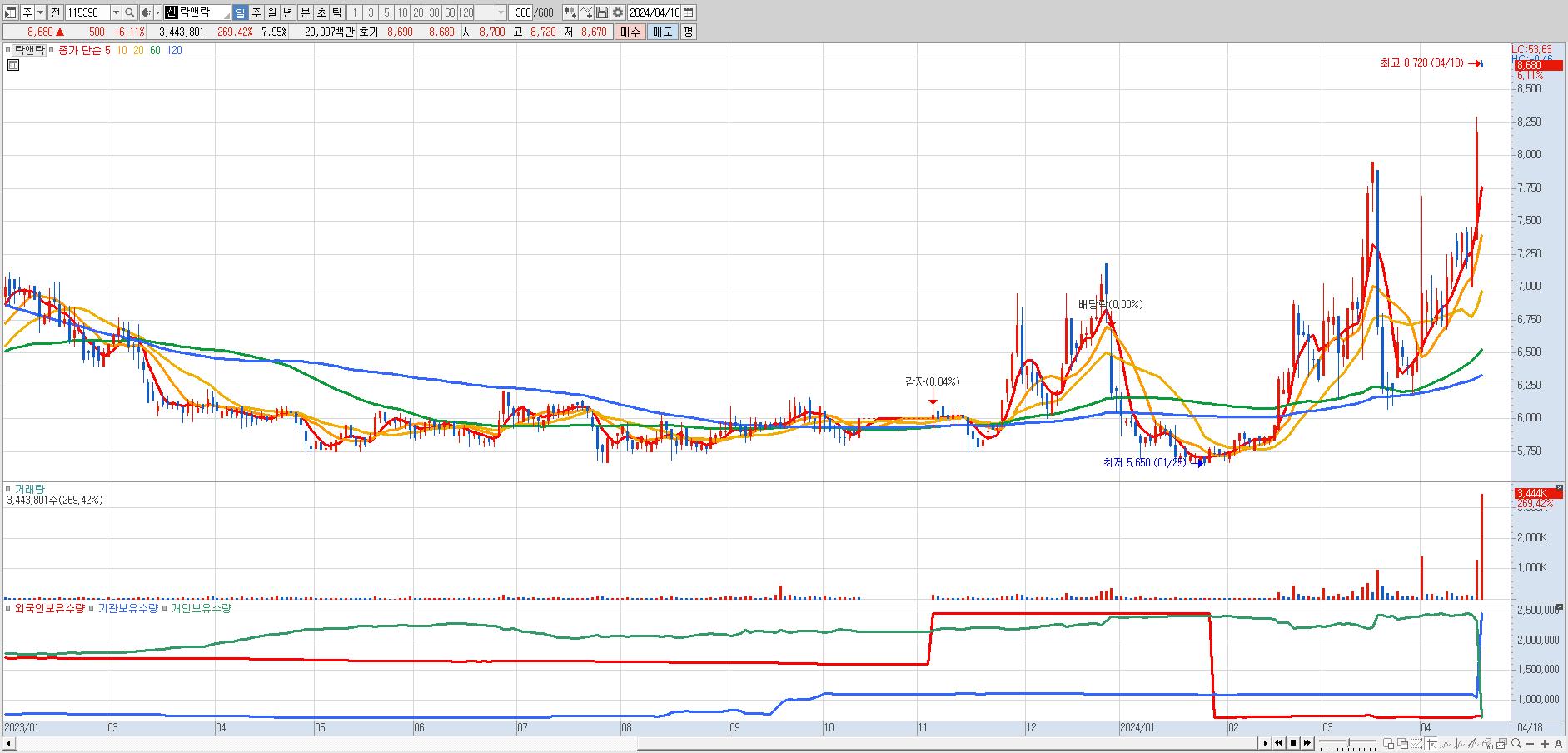 - 락앤락 (8,680원 ▲ 6.11% , 시총: 3,761억, 거래량: 3,440,588, 거래대금:299억, KOSPI)