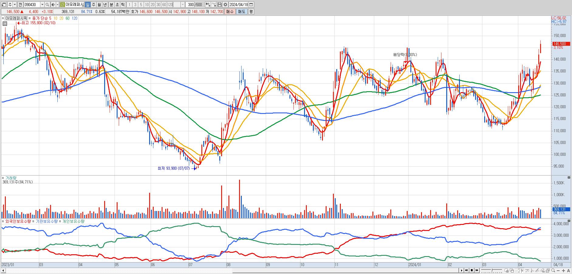 - 아모레퍼시픽 (146,500원 ▲ 3.1% , 시총: 85,692억, 거래량: 368,723, 거래대금:541억, KOSPI)