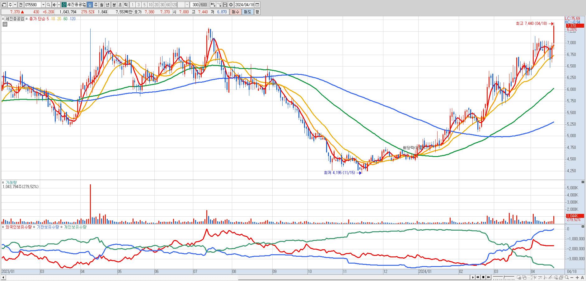 - 세진중공업 (7,370원 ▲ 6.2% , 시총: 4,190억, 거래량: 1,039,191, 거래대금:75억, KOSPI)