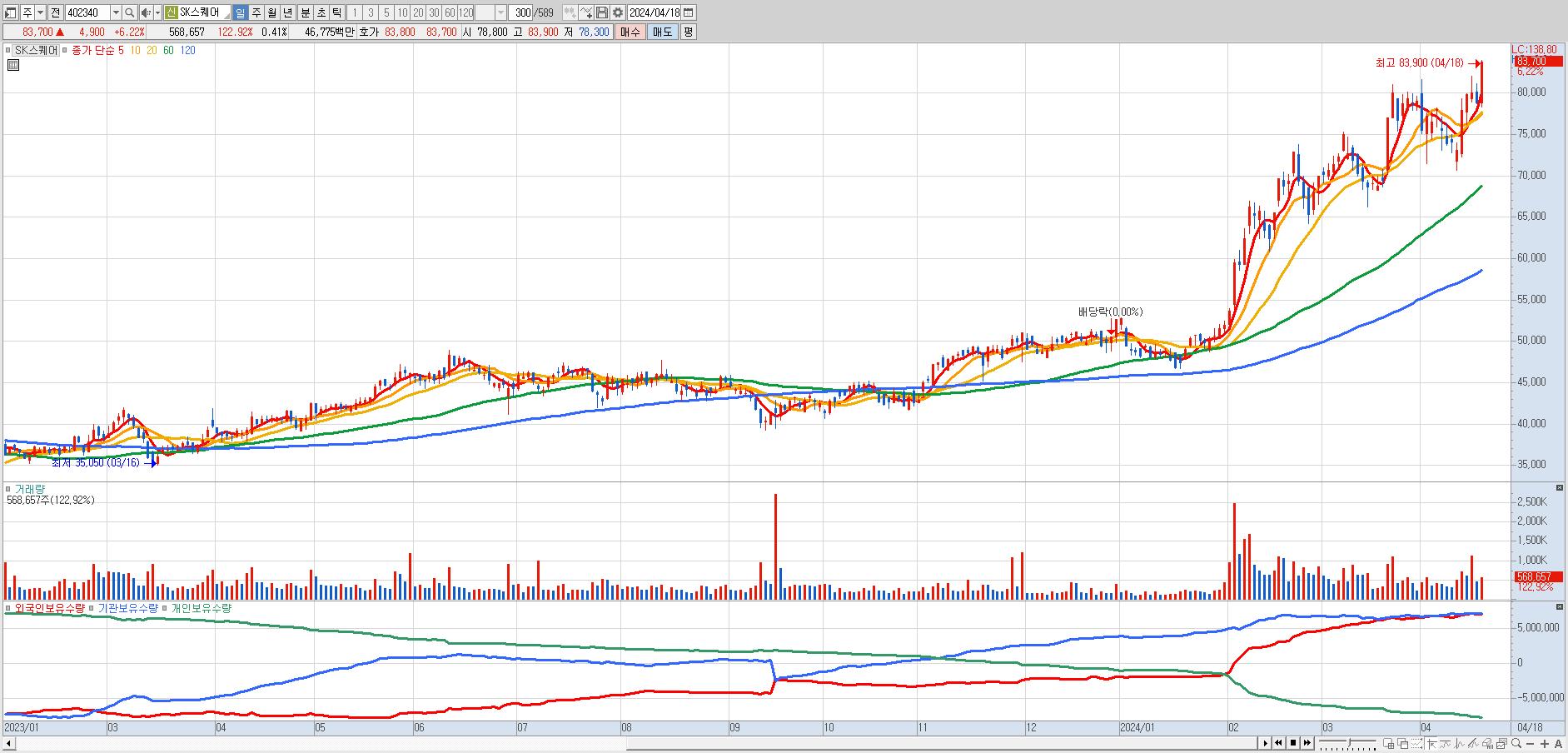 - SK스퀘어 (83,700원 ▲ 6.22% , 시총: 116,327억, 거래량: 567,469, 거래대금:467억, KOSPI)