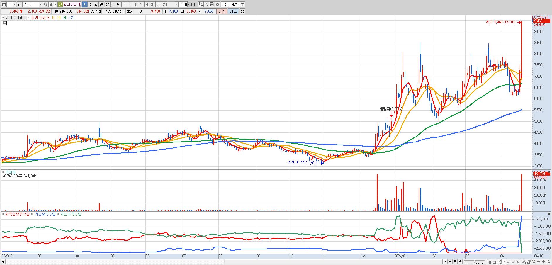 와이아이케이 9,460원 ▲ 29.95% (KOSDAQ, 232140)