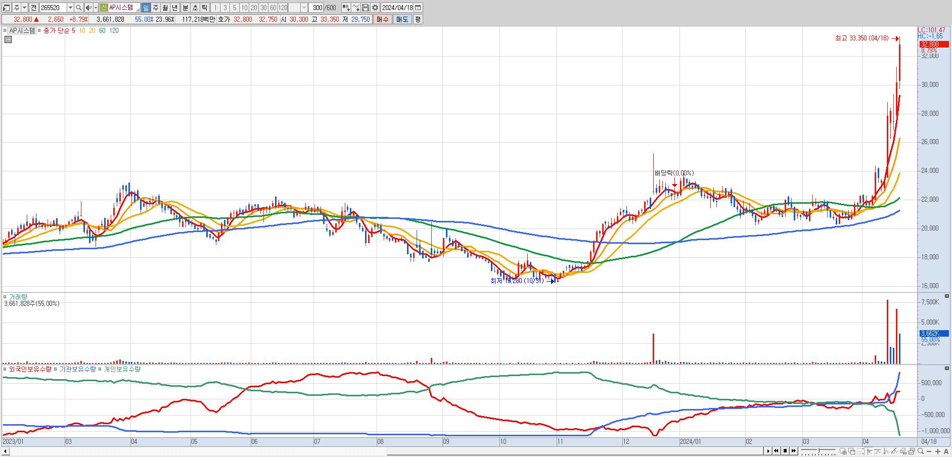 - AP시스템 (32,800원 ▲ 8.79% , 시총: 5,012억, 거래량: 3,635,175, 거래대금:1,164억, KOSDAQ)