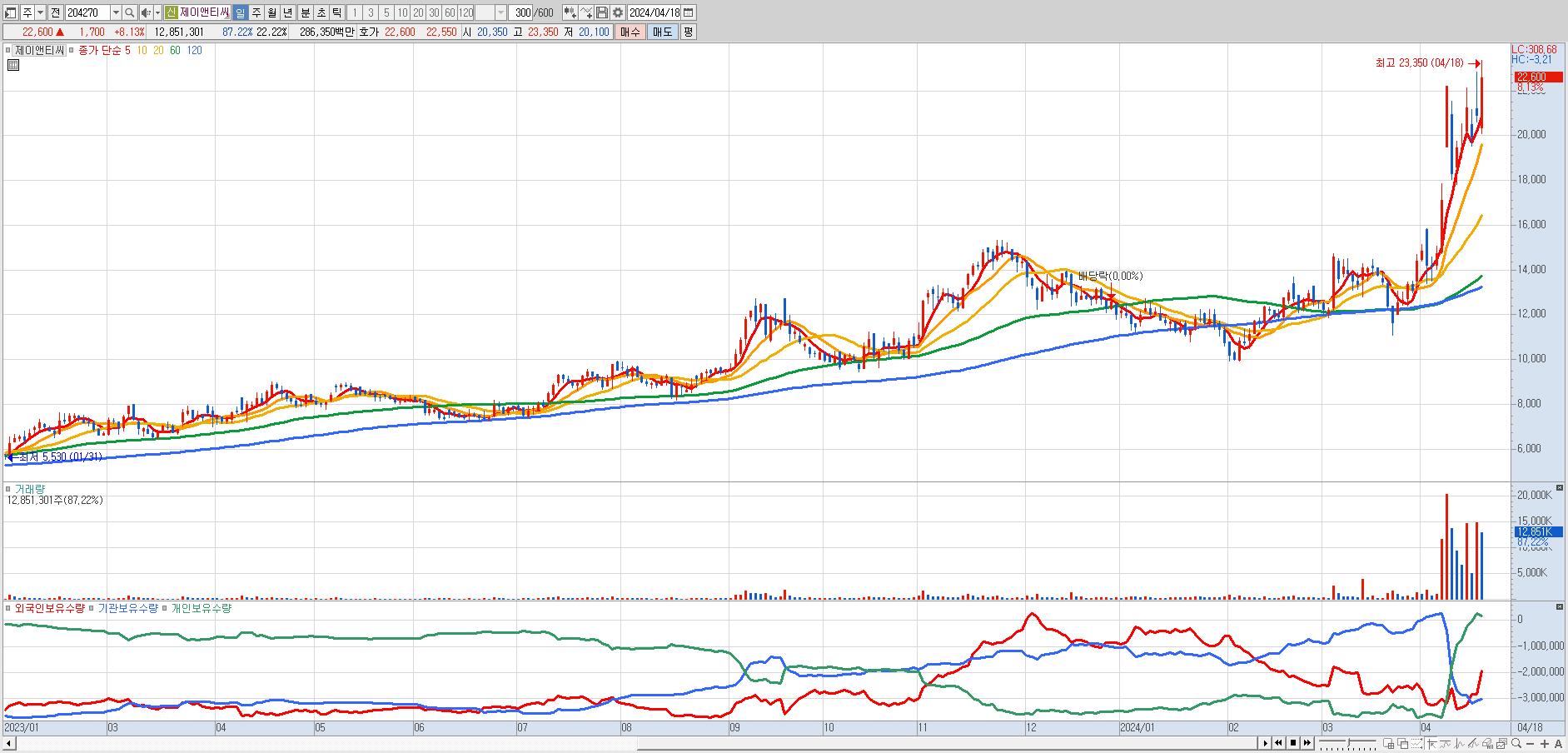 - 제이앤티씨 (22,600원 ▲ 8.13% , 시총: 13,074억, 거래량: 12,433,415, 거래대금:2,769억)