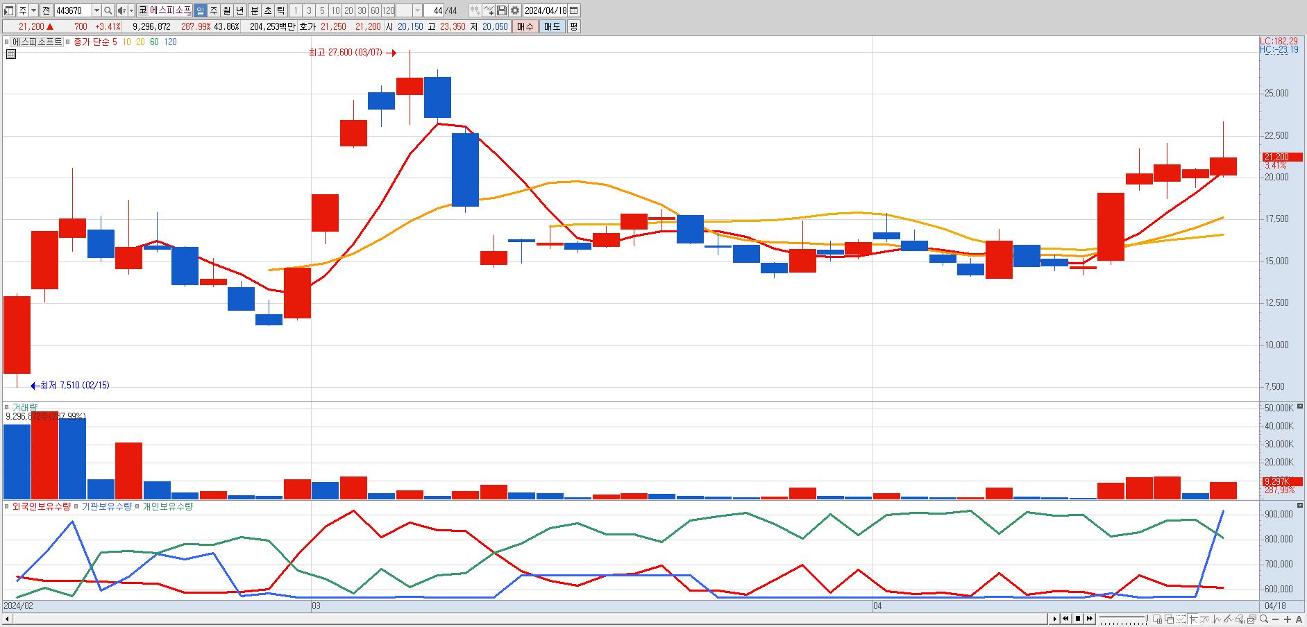 - 에스피소프트 (21,200원 ▲ 3.41% , 시총: 4,494억, 거래량: 9,240,630, 거래대금:2,031억)