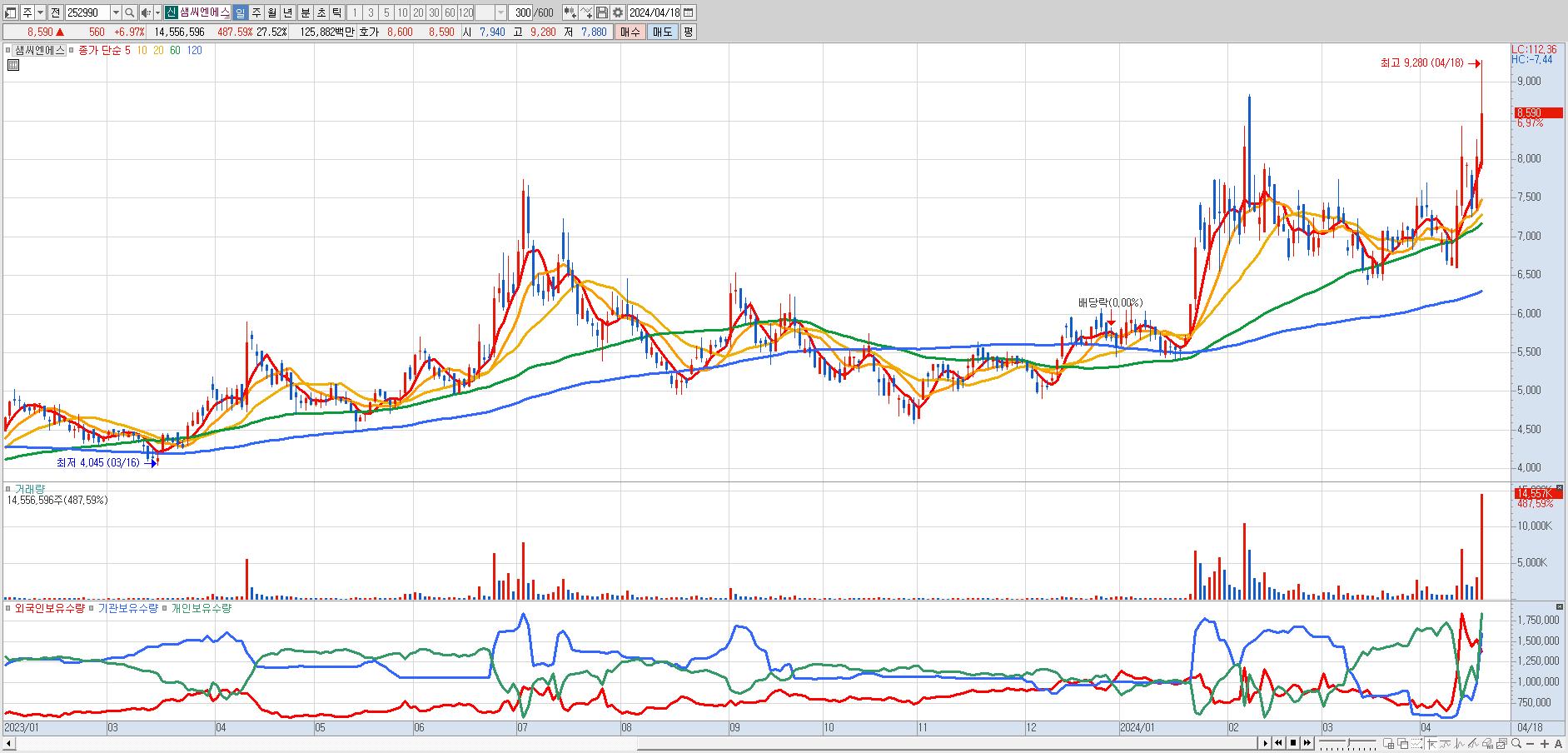 - 샘씨엔에스 (8,590원 ▲ 6.97% , 시총: 4,544억, 거래량: 14,474,500, 거래대금:1,252억)