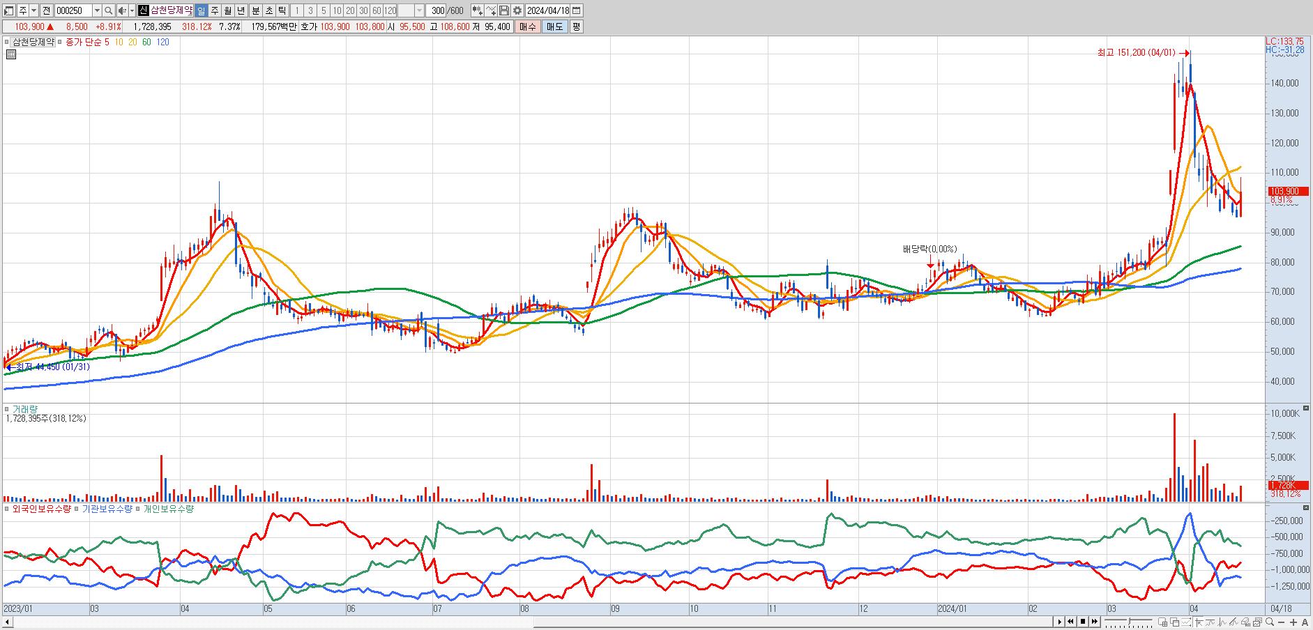 - 삼천당제약 (103,900원 ▲ 8.91% , 시총: 24,372억, 거래량: 1,718,169, 거래대금:1,785억)