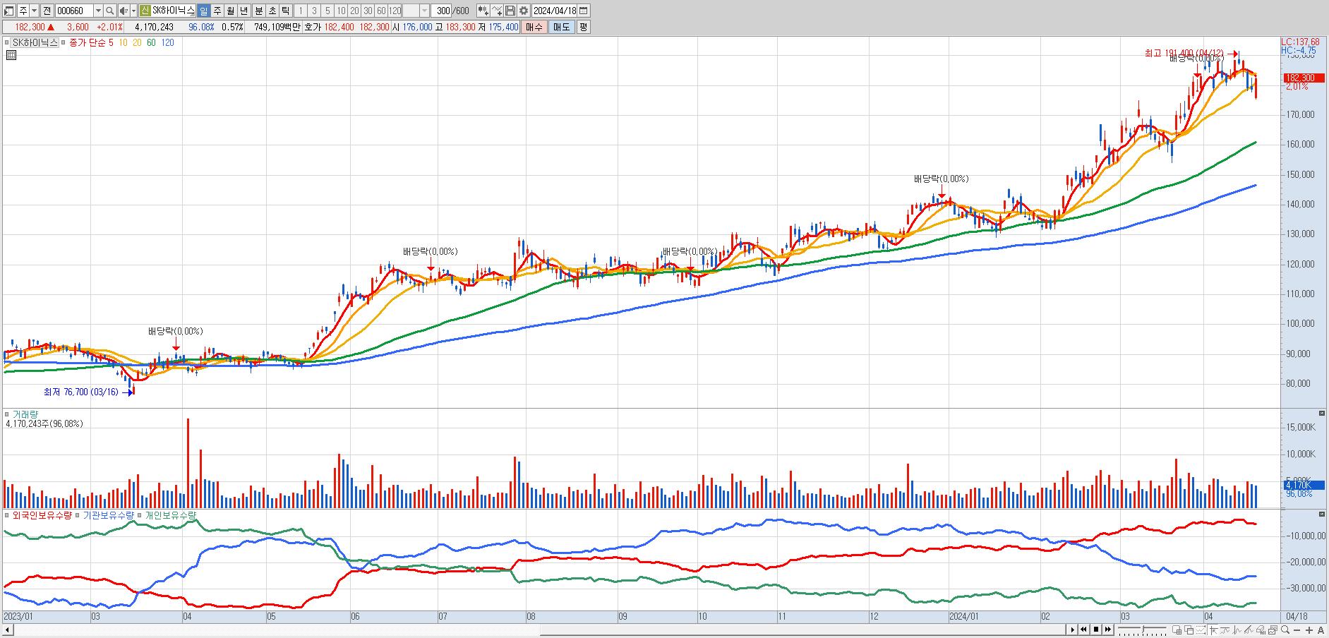 - SK하이닉스 (182,300원 ▲ 2.01% , 시총: 1,327,148억, 거래량: 4,141,827, 거래대금:7,439억)
