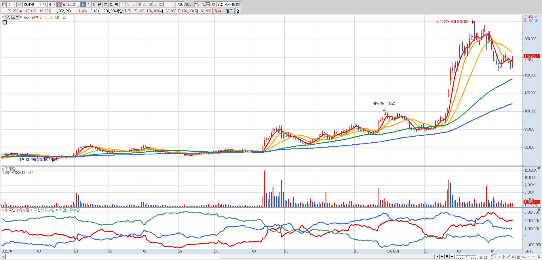 - 알테오젠 (176,200원 ▲ 9.58% , 시총: 93,407억, 거래량: 1,272,709, 거래대금:2,191억)