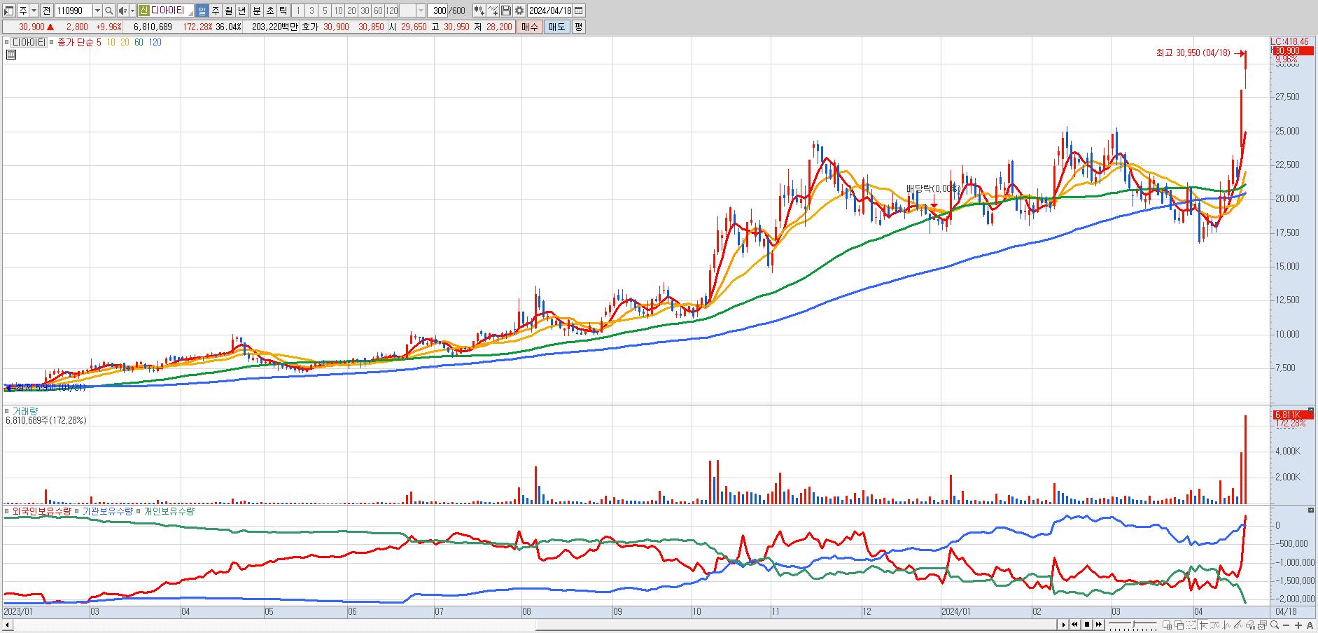 - 디아이티 (30,900원 ▲ 9.96% , 시총: 5,840억, 거래량: 6,772,534, 거래대금:2,020억)