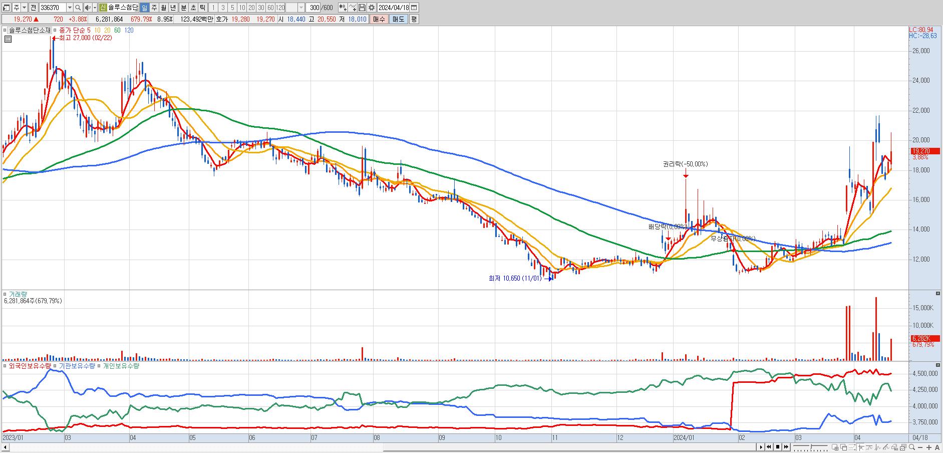 - 솔루스첨단소재 (19,270원 ▲ 3.88% , 시총: 13,531억, 거래량: 6,237,596, 거래대금:1,226억)