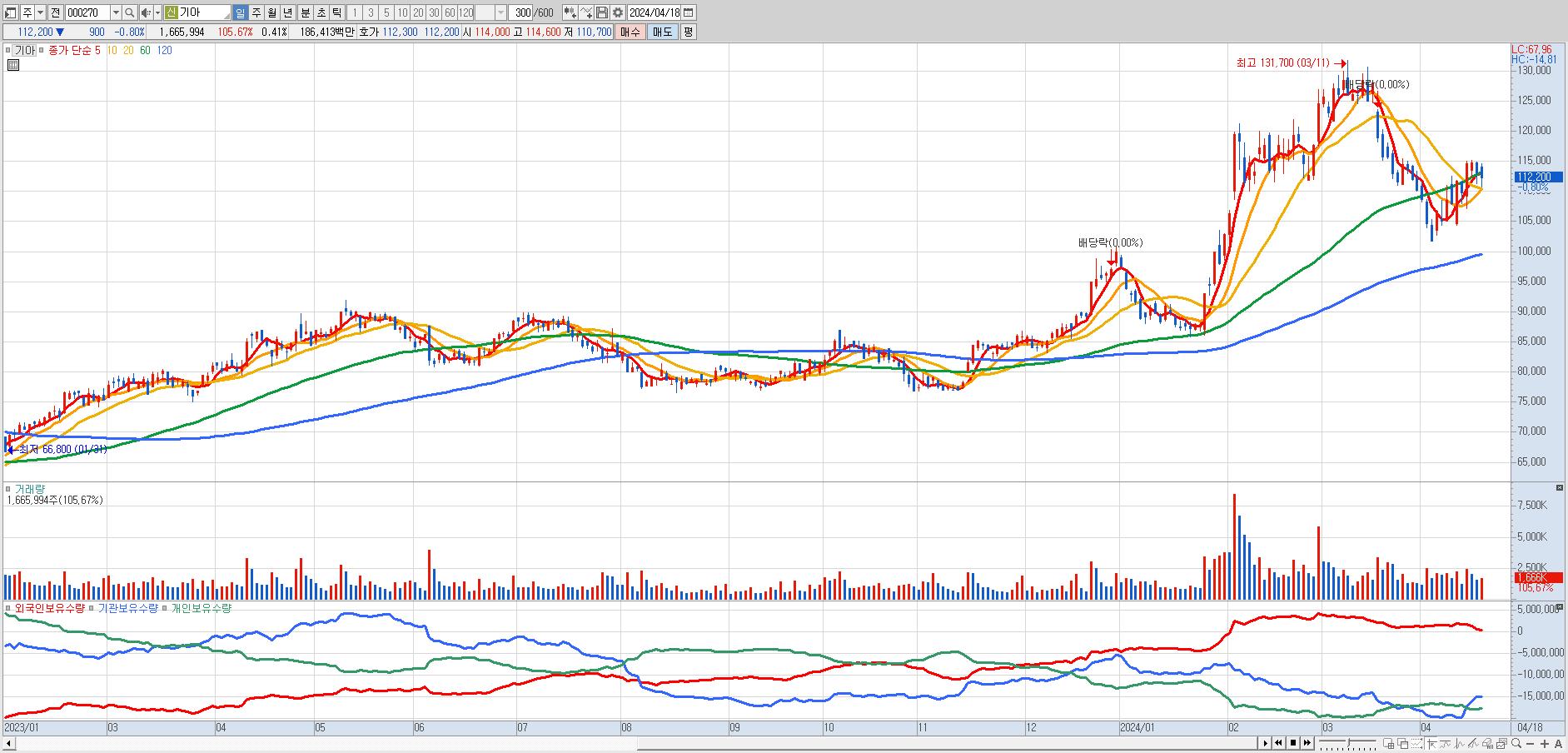 - 기아 (112,200원 ▼ -0.8% , 시총: 451,094억, 거래량: 1,657,938, 거래대금:1,855억)